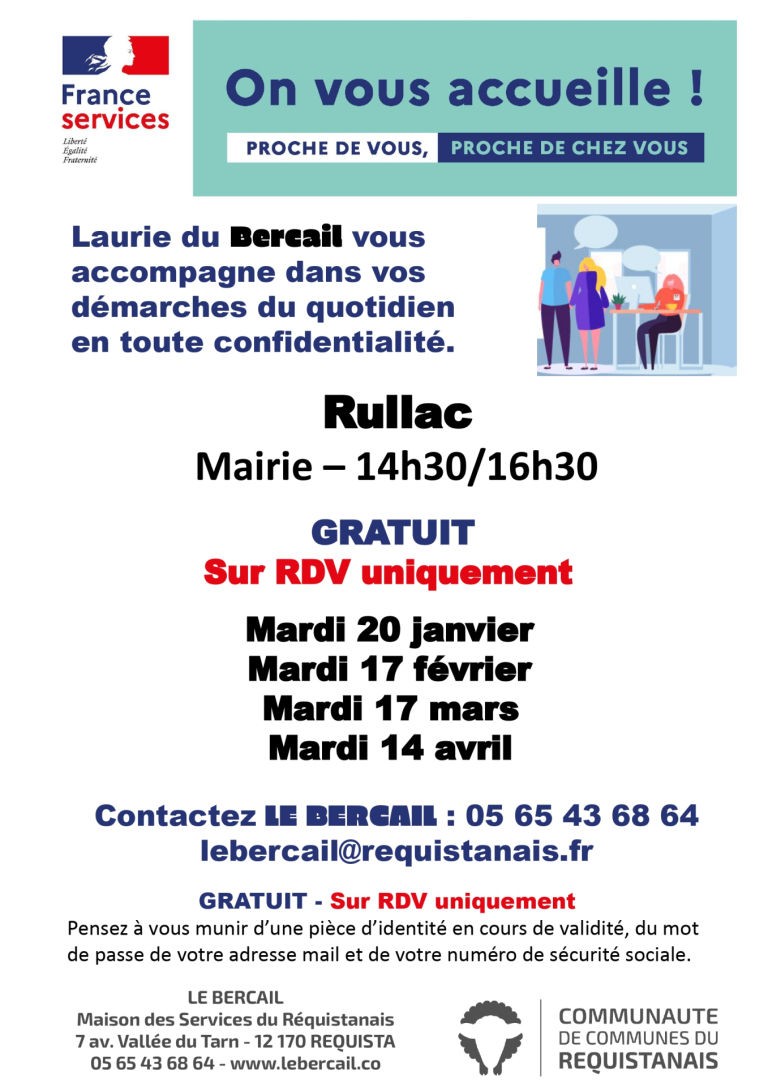 Voici le planning de présence de Laurie, maison France Service, Le Bercail pour les 4 1eres mois de 2026. N’oubliez pas de prendre rendez vous pour être accompagnés dans vos démarches quotidiennes