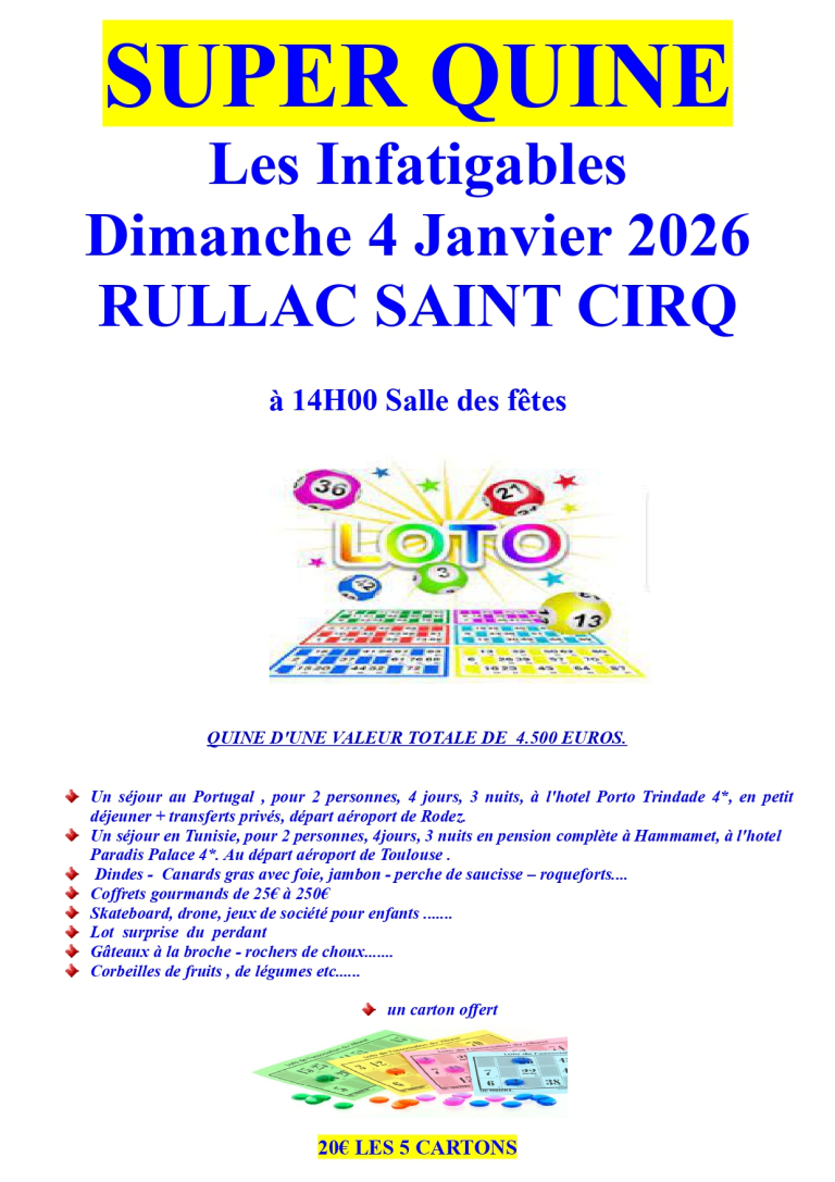 Pour bien démarrer la nouvelle année, le club des infatigables vous propose un après-midi Quine. Rendez-vous dès 14h à la salle des fêtes Valeur totale de cette quine : 4500€ !! 1 carton offert 20€ les 5 cartons