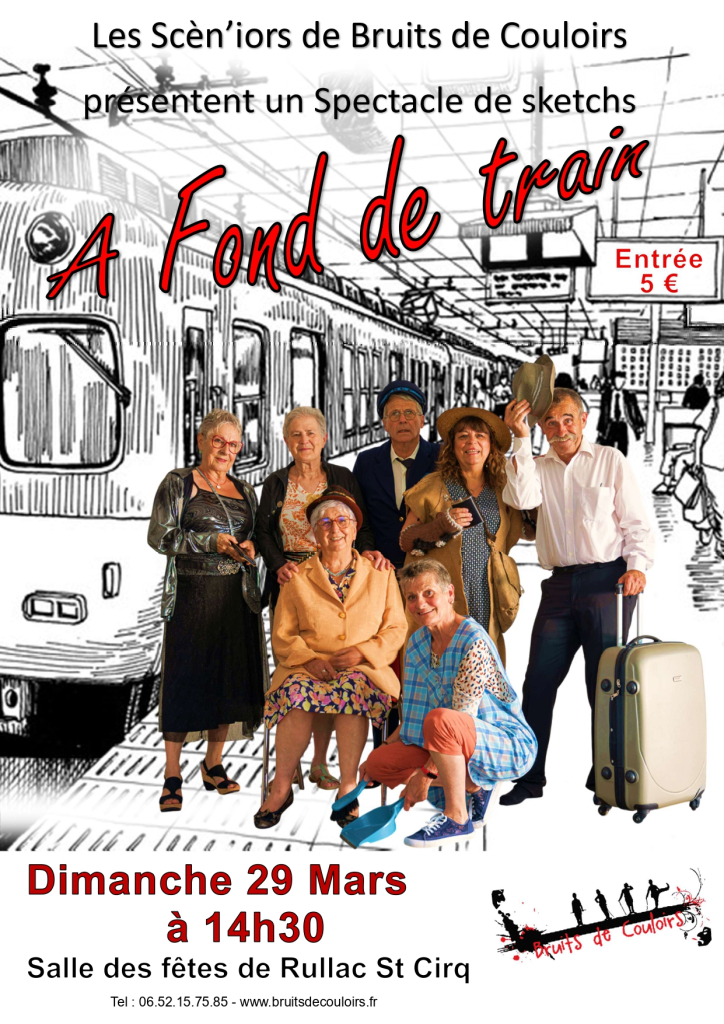 Dimanche 29 mars 2026, à la salle des fêtes de Rullac, le groupe Scèn’iors de l’Association « Bruits de Couloirs », va venir vous présenter leur nouveau spectacle « A fond de train ».