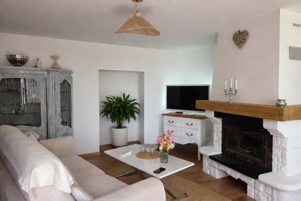 A l’interieur, une chambre avec placard, un dressing, une salle de bain avec douche et baignoire, un wc séparé, une cuisine entièrement équipée, un salon avec cheminée, la climatisation est également présente.